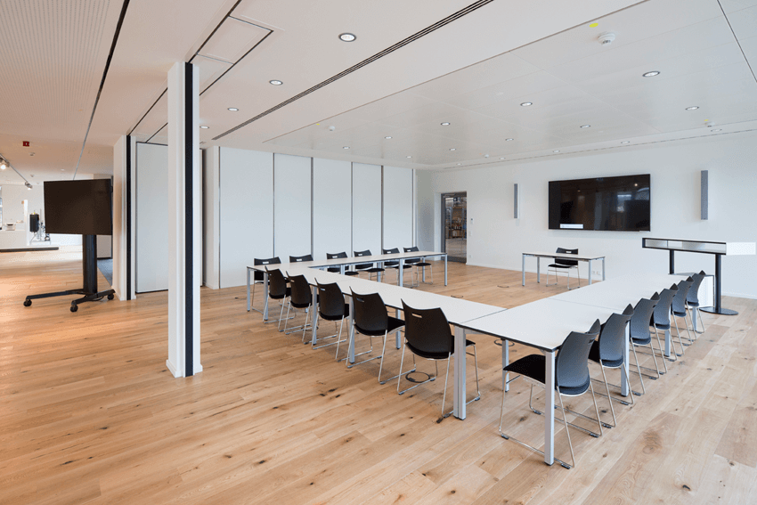 Die schallschluckenden Deckenelemente sorgen nicht nur für eine optimale Temperaturregelung, sondern verbessern auch die Raumakustik und schaffen so eine angenehme Arbeitsumgebung. Dank der leistungsstarken Raumlufttechnik (RLT-Anlage) mit einer Förderkapazität von 22.000 m³/h wird eine kontinuierliche Frischluftzufuhr gewährleistet. Durch die Kombination von Geothermie mit modernsten Anschlusstechnologien lassen sich zudem jährlich rund 42.000 kg CO₂ einsparen.